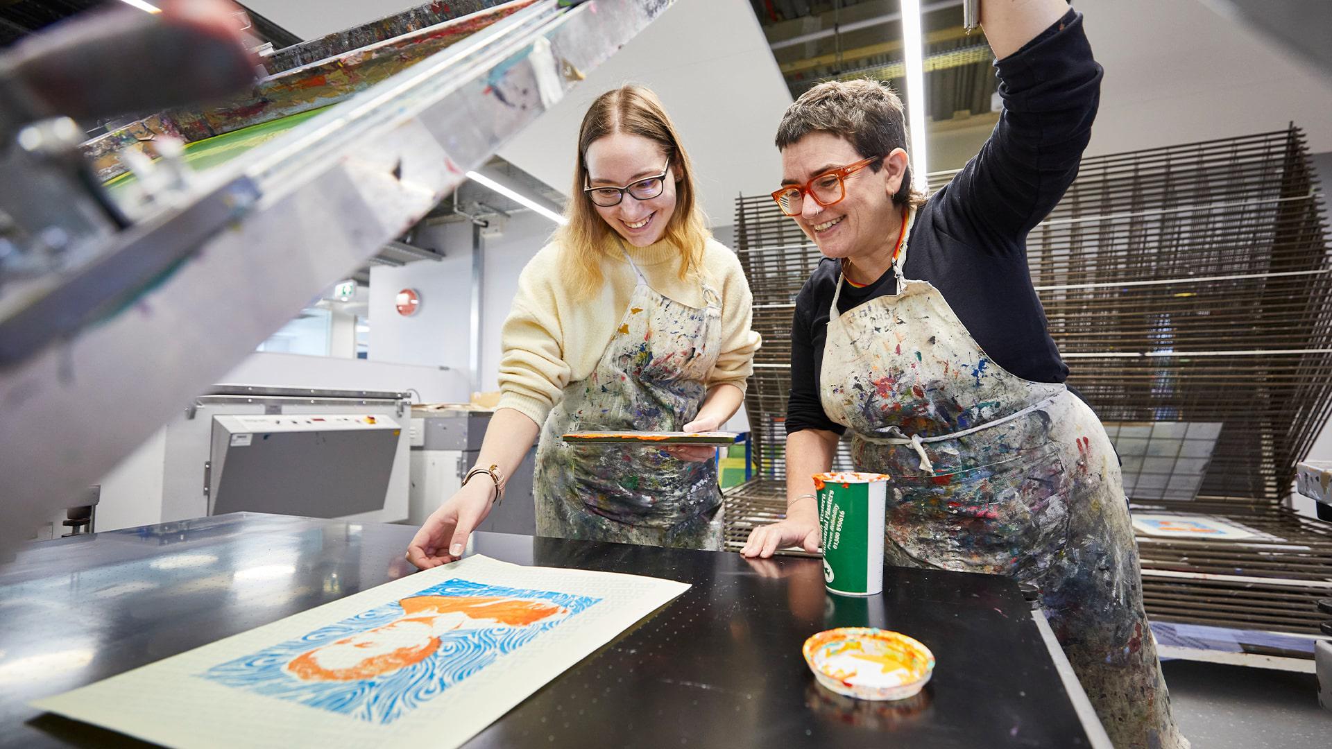 Our dedicated fine art studios are equipped to enable you to accomplish your talent through craft. You’ll be allocated personal studio space and have full access to a range of specialist workshops including sculpture with metalwork, welding, woodworking and casting equipment; print-making with intaglio, dry point, etching, silkscreen, woodcut and letterpress facilities; and a digital print workshop with high-quality large-scale print facilities, high-end scanners and the latest software; as well as photography darkrooms and studios.