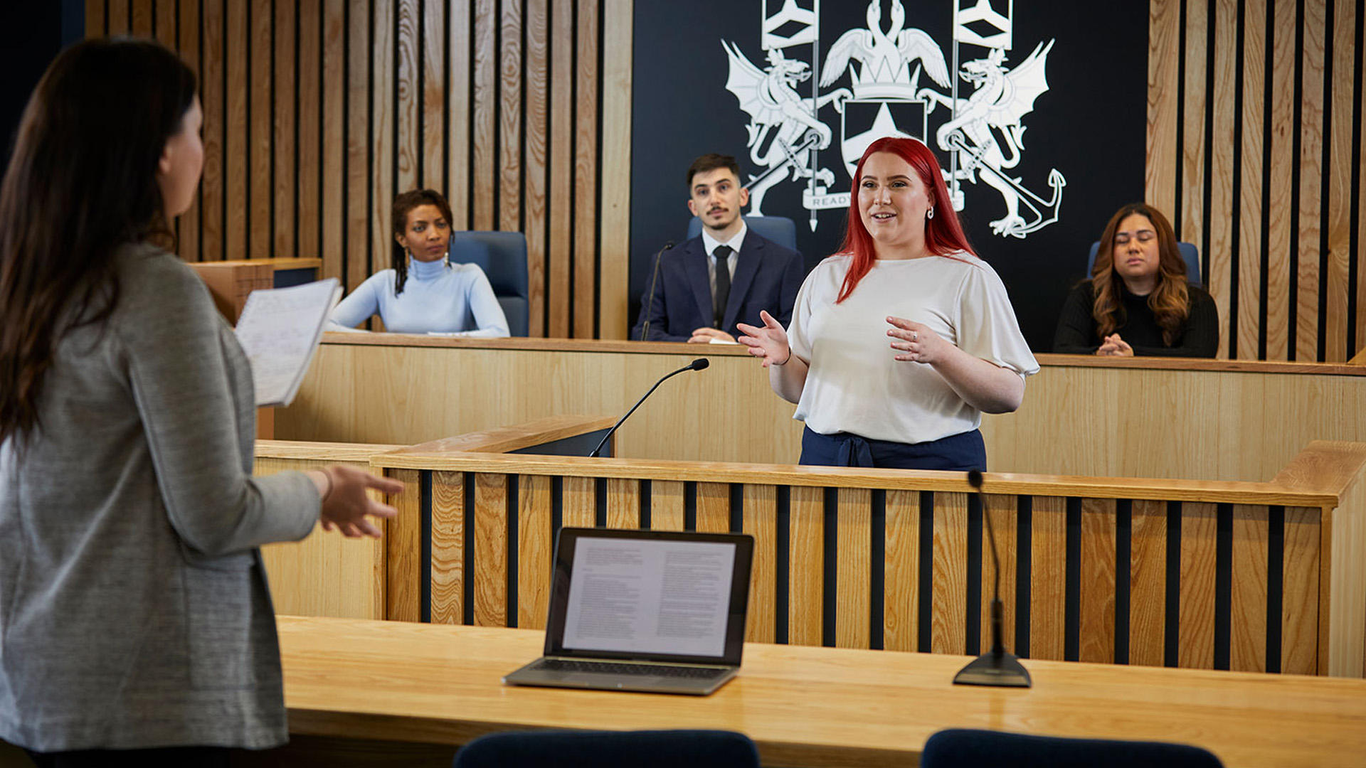 Law students have access to the moot court room to practice their courtroom and debating skills in a real-world environment, as well as access to our portable crime scene.