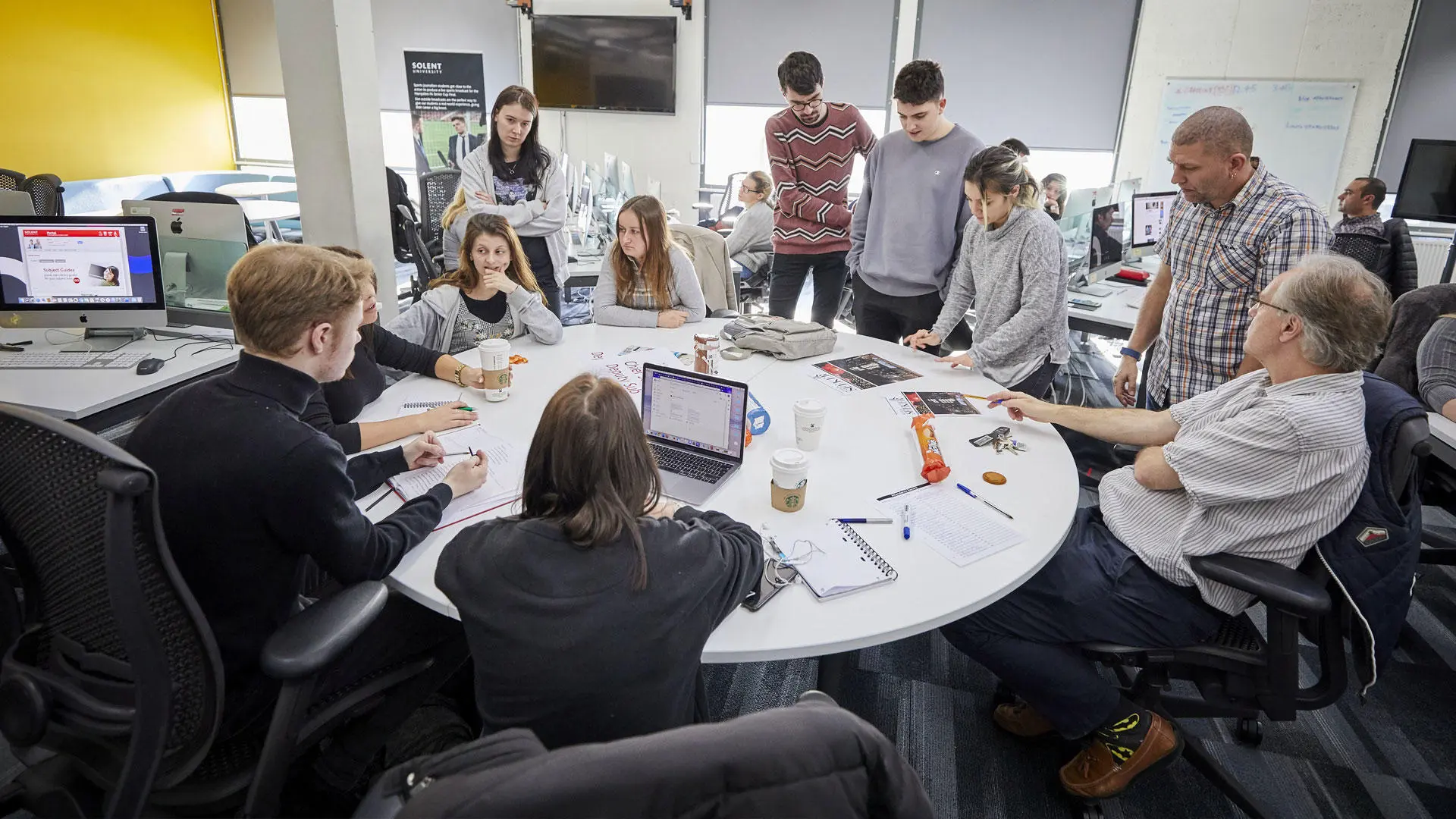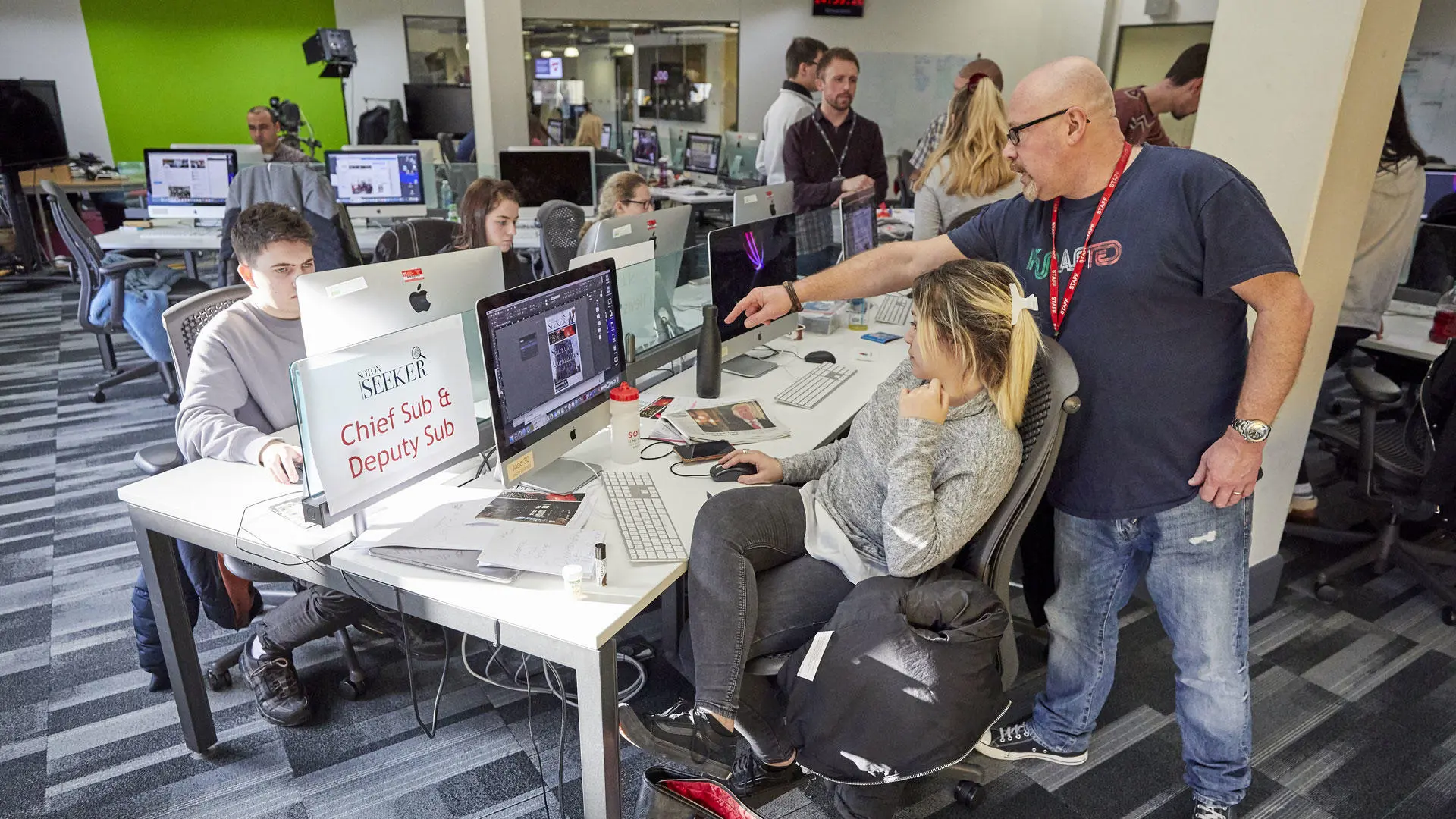 Equipped with 40 iMacs running iNews, Final Cut and the Adobe CC suite, the industry-reflective newsroom enables students to run news day’s encompassing video, radio, web and print in one collaborative space. The newsroom also allows delivery of all aspects of teaching the University's range of journalism courses.Â